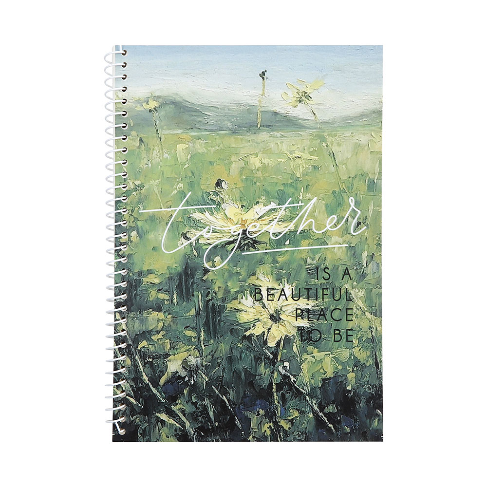 Tamanho 21×14.5. Caderno espiral wire-o com pauta, capa fina 350 gramas com detalhe alto-relevo, 50 folhas de 80g