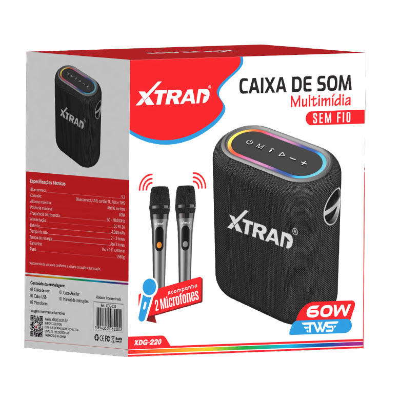 Caixa de som com 2 microfones SEM FIO, 60W, Bluetooth