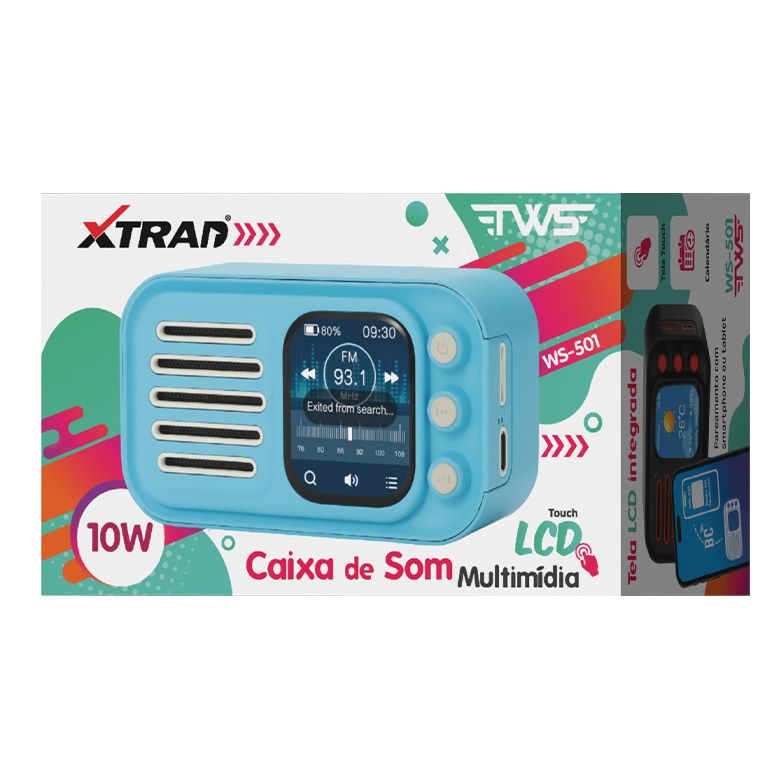 10W, Bluetooth, multimídia LCD, TWS, Alarme, Rádio FM, Cartão TF, Gravação, Modo Foto, Calendário,E qualizado, Bluetooth, Previsão do Tempo