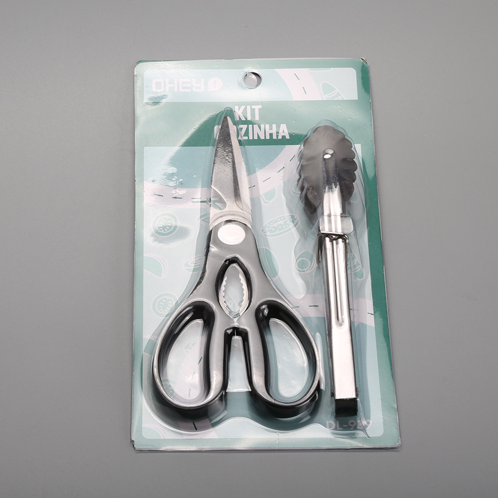 Kit cozinha com tesoura e pegador.