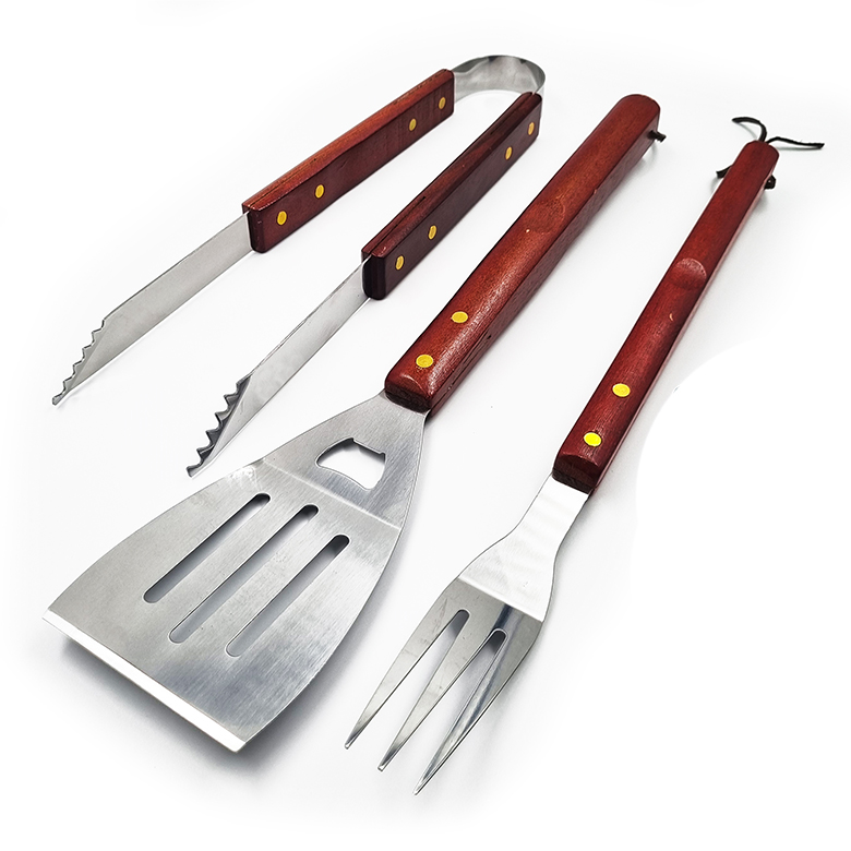 inox com cabo de madeira com 3 peças (garfo, espátula e pegador).